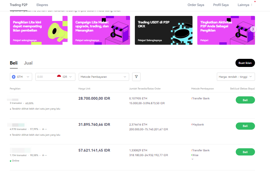 Selain menggunakan fitur Beli Cepat, ada cara lain yang bisa kamu tempuh untuk beli Ethereum di OKX, yakni dengan menggunakan perdagangan peer-to-peer (P2P). Dalam opsi ini, kamu bisa langsung beli Ethereum atau aset kripto lainnya dari pengguna lain yang menjual aset kripto mereka secara personal di platform OKX.