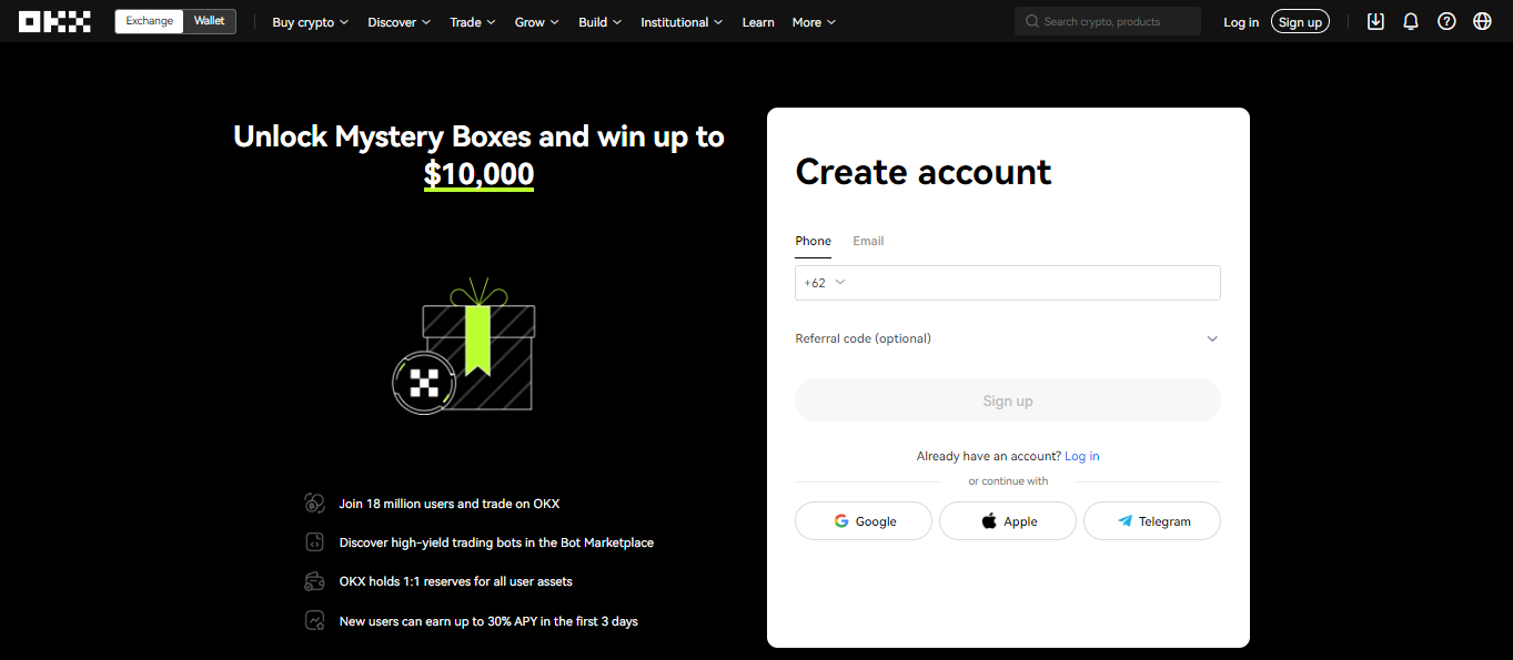 Langkah pertama, tentu saja kamu perlu login ke akun OKX milikmu terlebih dulu. Jika belum punya akun OKX, kamu bisa membuatnya lewat tautan ini untuk mendapatkan bonus selamat datang hingga US$10.000.
