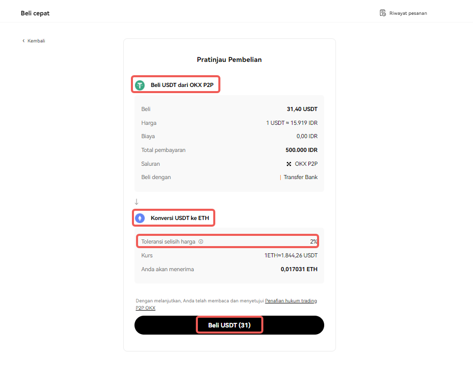 Sesudah mengeklik tombol “Berikutnya”, kamu akan dialihkan ke laman yang memperlihatkan berapa banyak stablecoin USDT yang diperlukan untuk beli ETH. Sebagai informasi, beli Ethereum lewat fitur “Beli Cepat” di OKX menggunakan skema crypto-to-crypto. Maka dari itu, mata uang fiatnya akan dikonversi secara otomatis ke dalam bentuk stablecoin USDT, lalu jumlah USDT tersebut akan dikonversi secara otomatis ke dalam bentuk ETH.