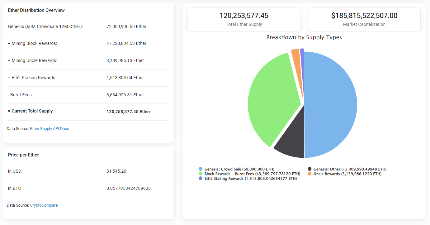 Total pasokan Ether saat ini mencapai 120.265.519,43 ETH. Jumlah itu dikontribusikan dari hadiah blok penambangan (mining block reward) sebanyak 47.223.894,59 ETH, hadiah uncle mining sebanyak 3.139.986,13 ETH, dan Eth2 Staking Rewards sebanyak 1.538.467,12 ETH.