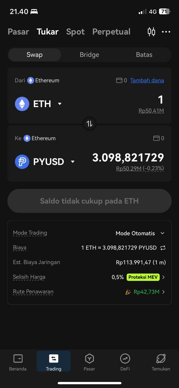 Langkah keempat: gunakan fungsi Trading, lalu Swap untuk menukar USDT dengan stablecoin PYUSD. Kamu dapat menukar sejumlah USDT langsung ke PYUSD. Sisakan jumlah USDT yang cukup untuk menutupi biaya transaksi.