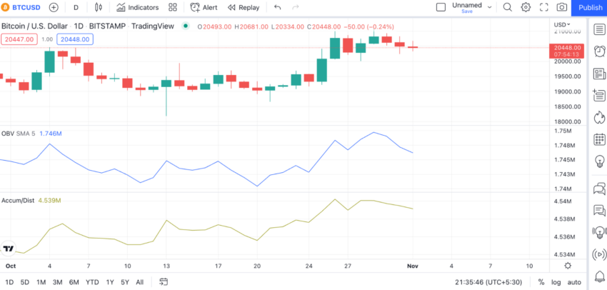 On Balance Volume digambarkan dengan garis biru di bagian bawah dan Indikator Accumulation and Distribution digambarkan dengan garis hijau.