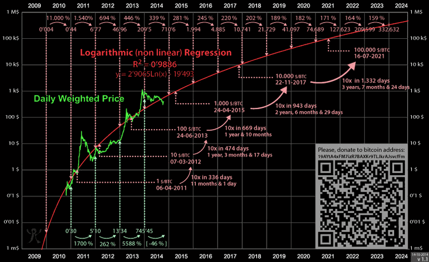 Grafik yang semula hanya untuk hiburan, mendadak menjadi sorotan utama. Ketika popularitas grafik ini meroket, Trolololo — seorang pengguna Bitcointalk — pun memasangkannya dengan Logarithmic Regression pada tahun 2014 dan memberikannya bentuk dan tujuan dalam prosesnya.