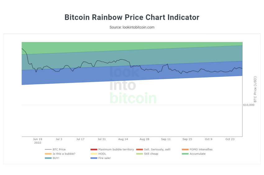 Berdasarkan level harga saat ini, BTC berada di zona biru, yang pada dasarnya adalah zona diskon (fire sale), menurut Rainbow Chart.