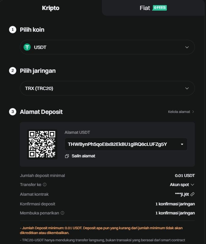- Kirim dari dompet/wallet kamu ke alamat tertera. Pastikan jaringan yang kamu pilih sama untuk menghindari kehilangan. Kisaran waktu transfer bergantung pada jaringan, mohon cek secara berkala. Deposit kamu akan masuk di Dompet dan bisa kamu pergunakan untuk melakukan trading atau jual/beli dengan crypto lainnya.