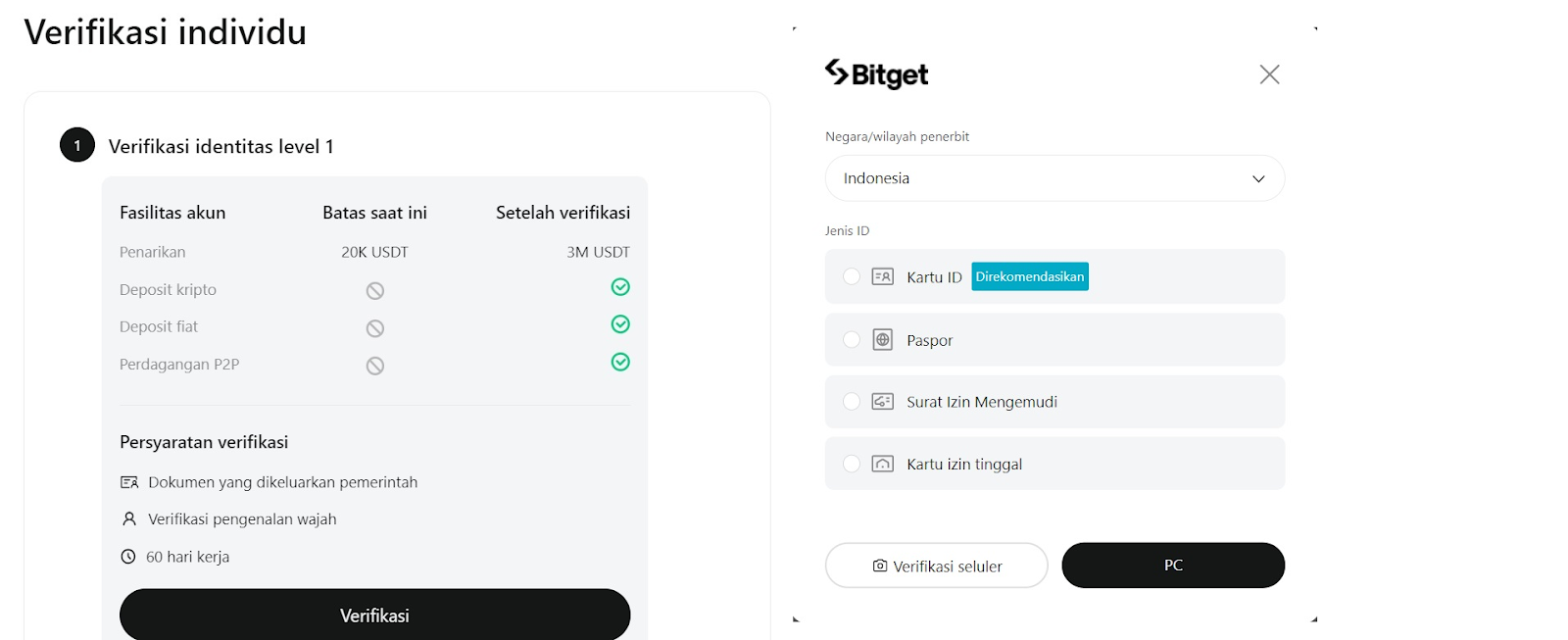 - Selanjutnya, kamu dapat memilih verifikasi lengkap atau mulai mengakses fitur terbatas. Jika kamu ingin menggunakan fitur seperti copy trading, spot trading, dan margin trading, siapkan tanda pengenal berupa E-KTP.