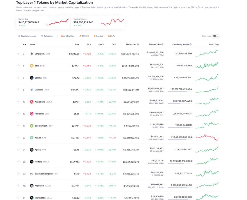 Sekarang setelah kita mengetahui cara kerja blockchain layer-1, mari kita lihat lebih dekat contohnya. Kita telah mengidentifikasi Bitcoin dan Ethereum sebagai rantai lapisan-1 yang terkenal. Namun, jaringan seperti Cardano, Solana, dan Binance Smart Chain juga merupakan jaringan lapisan-1 yang punya dampak besar.