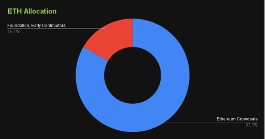 Dalam awal distribusi, sebanyak 83,13% ETH dialokasikan ke Ethereum crowdsale dan 16,68% ditujukan untuk Ethereum Foundation serta kontributor awal.