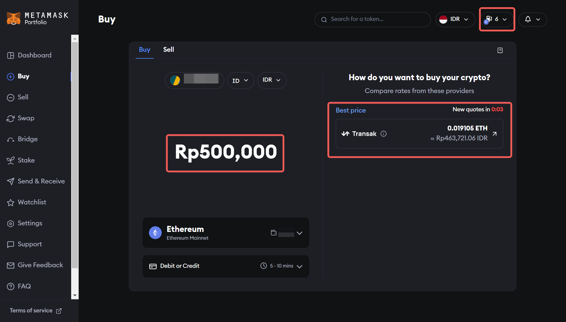 Di sebelah kanan laman, kamu akan melihat “Quote” atau nilai kuotasi dari mitra pihak ketiga MetaMask untuk layanan pembayaran. Sebenarnya, MetaMask berekan dengan beberapa perusahaan pemroses pembayaran, seperti Transak dan MoonPay, tapi ketersediannya bergantung pada wilayah dan mata uang yang pengguna pilih. Karena dalam tutorial cara beli ETH MetaMask ini kita ingin menggunakan mata uang rupiah, hanya tersedia 1 penyedia layanan, yakni Transak.