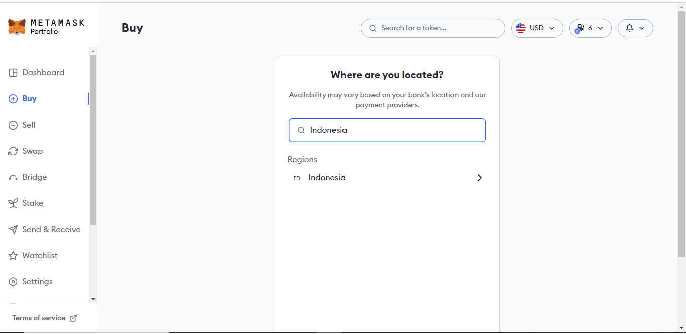 Setelah memiliki akun, masuk ke laman utama MetaMask, lalu klik tombol “Buy”. Dari situ, kamu akan dibawa untuk memilih negara tempat kamu berada. Bagi yang berada di Indonesia, bisa ketik “Indonesia” agar mendapatkan pilihan pembayaran yang sesuai.