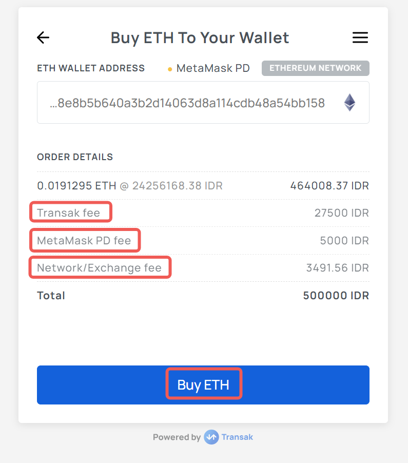 Berikutnya, kamu akan diarahkan ke laman Transak. Laman ini menampilkan informasi nominal beli ETH yang sudah ditambah dengan beberapa biaya; seperti biaya dari Transak, biaya MetaMask, dan biaya jaringan. Jika semuanya sudah sesuai, klik tombol “Buy ETH”.