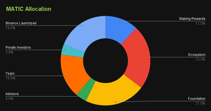 Saat ini, terdapat pasokan tetap sebanyak 10 miliar token MATIC, yang mana 91% di antaranya sudah beredar. Dari total jumlah token yang ada, 38% dialokasikan untuk penjualan publik dan private, serta 21% dari total pasokan didistribusikan ke Polygon Foundation.