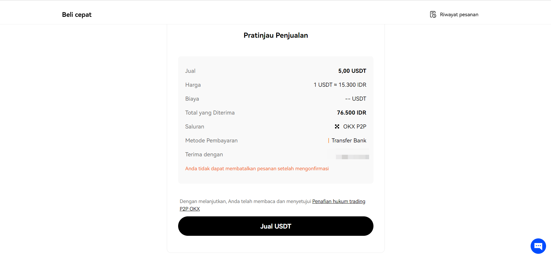 Untuk menjual USDT melalui menu ini, kamu perlu mengisi data rekening bank yang ingin digunakan untuk menerima hasil penjualan. Pastikan nama yang terdaftar di nomor rekening sama dengan nama saat verifikasi KYC di OKX.