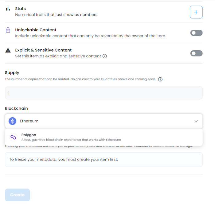 Blockchain – agar bisa mencetak NFT gratis dan menghemat biaya transaksi, kamu harus memilih opsi Polygon pada bagian “Blockchain” ini.