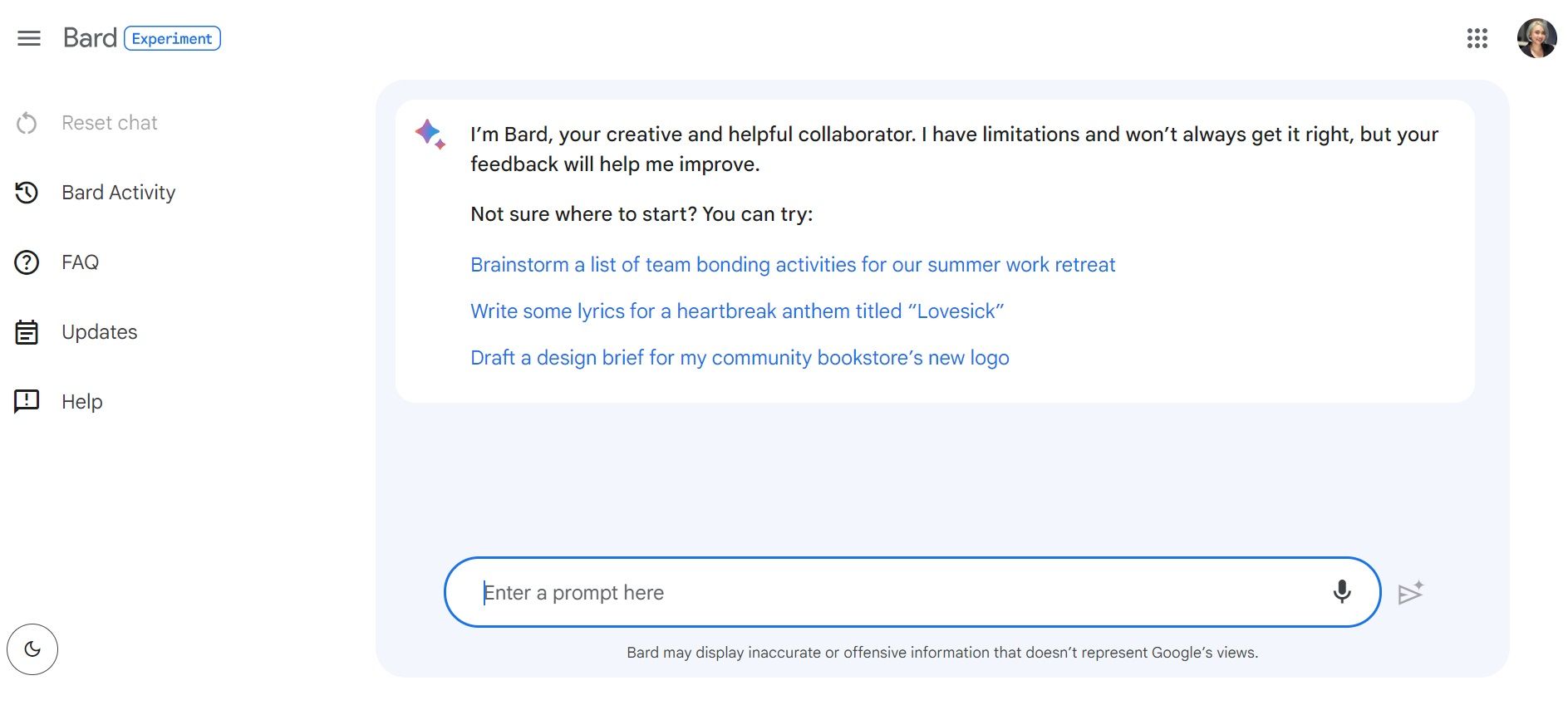 Kamu akan melihat awal percakapan dari Bard. Mulai masukkan pertanyaan atau perintah di kotak “Enter a prompt here“. Saat ini layanan chatbot ini hanya tersedia dalam Bahasa Inggris, Jepang dan Korea. Makanya, kamu hanya bisa menuliskan pertanyaan atau instruksi (prompt) dalam tiga bahasa tersebut untuk jawaban yang sesuai.