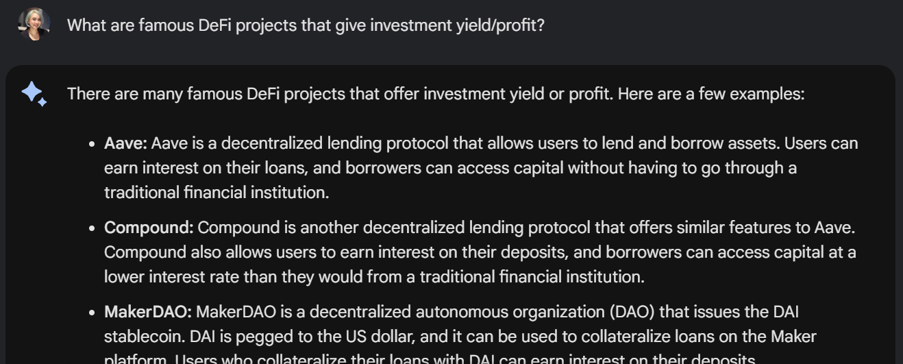 Bard AI dapat membantu kamu berinvestasi dalam crypto dan DeFi (Decentralized Finance) dengan beberapa cara berikut. Bila ingin jawaban yang lebih terperinci, pastikan pertanyaan kamu lebih spesifik seperti contoh berikut.