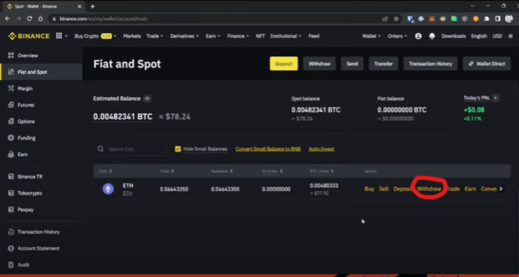 Di halaman Fiat and Spot, kamu bisa melihat jumlah saldo (balance) dari cryptocurrency yang kamu miliki. Lalu di daftar aset yang ingin kamu tarik, klik Withdraw.