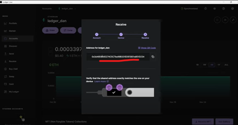 - Lihat dan salin alamat wallet. Klik nama akun yang baru kamu buat tersebut. Lalu, klik tombol Receive untuk melihat alamat wallet penerima aset ETH kamu. Pastikan alamatnya sama dengan yang tampil dalam perangkat hardware Ledger kamu. Kemudian, kamu bisa menyalin alamat wallet tersebut.