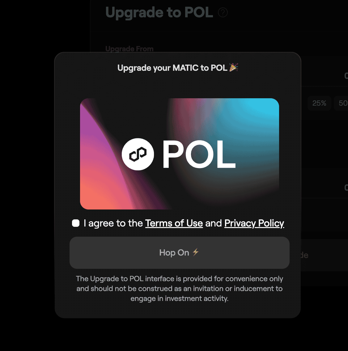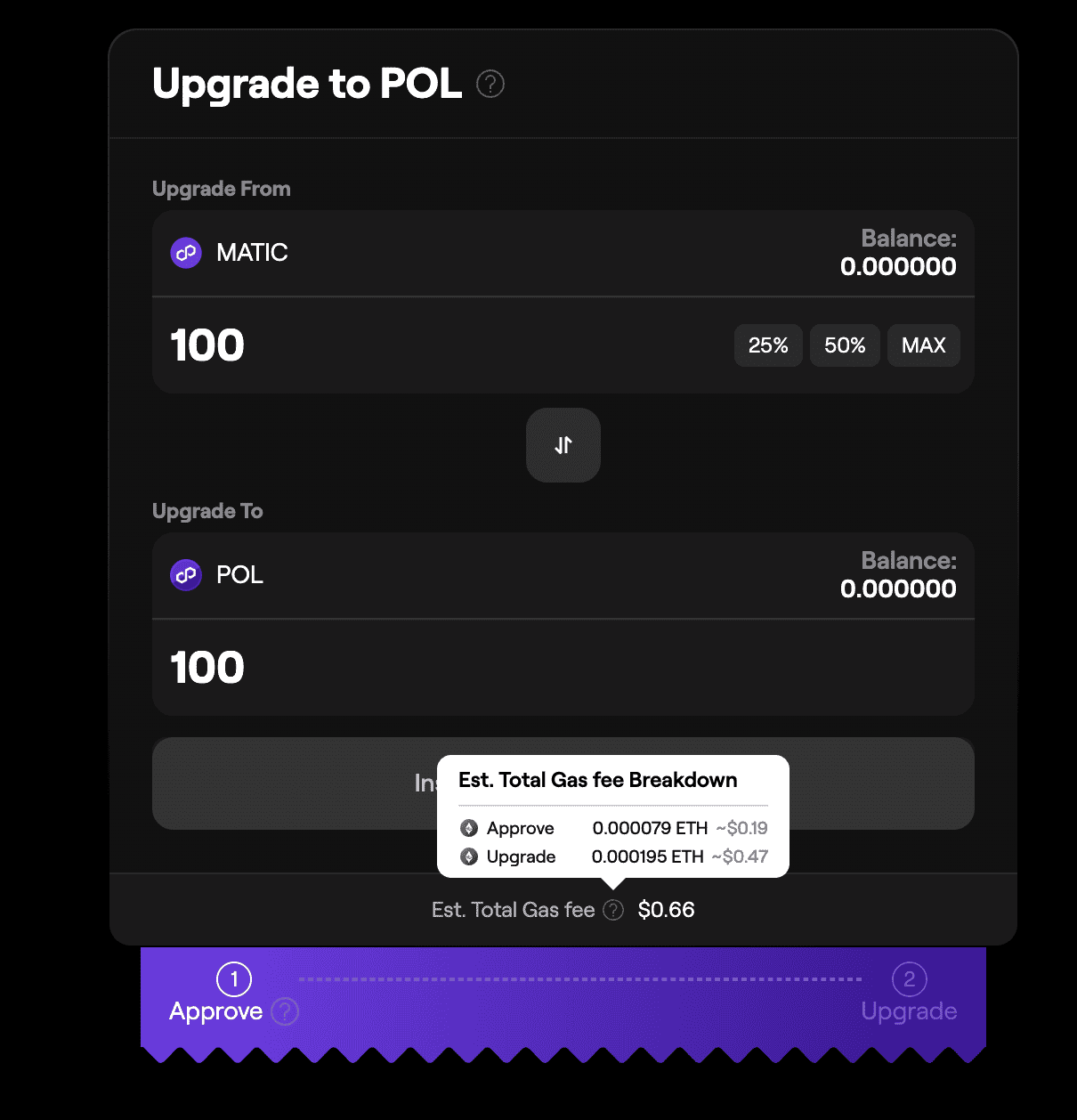 Setelah disetujui, klik “Upgrade” untuk menukar token MATIC dengan token POL secara 1:1. Konfirmasikan transaksi “Upgrade” di dompet kamu.