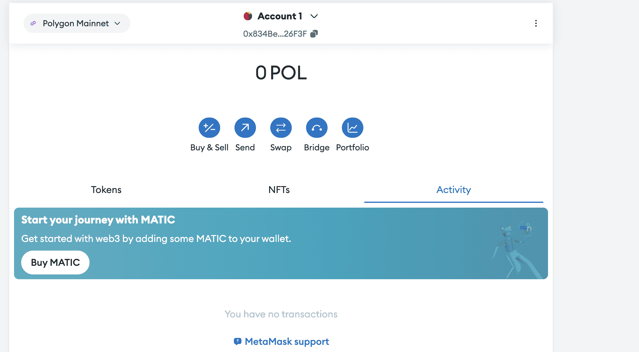 Setelah transaksi selesai, kamu akan melihat token POL di dompet kamu. Jika token tidak muncul, kamu mungkin perlu menambahkan alamat kontrak POL secara manual.