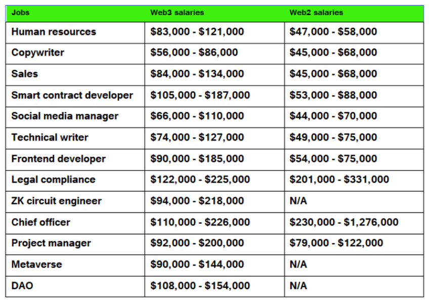 Tidak hanya ada banyak jalur karier di bidang Web3, tetapi juga banyak pekerjaan dengan gaji tinggi. Semakin Anda naik ke posisi yang lebih tinggi, semakin kompetitif pula penawaran dan paket yang Anda akan dapatkan.