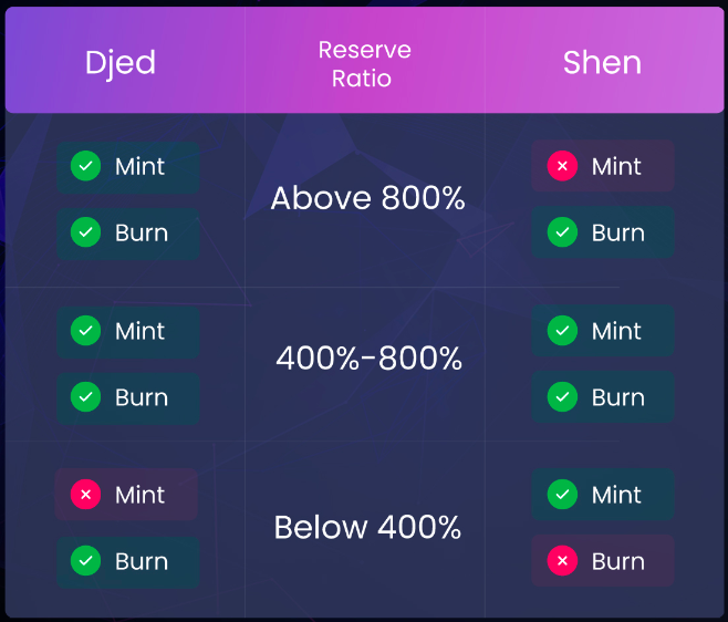 Rasio cadangan SHEN terhadap $DJED selalu terjaga antara 400% hingga 800% untuk bisa selalu mencetak (mint) dan membakar (burn) koin Djed. Apabila rasio cadangan sudah lebih dari 800%, tidak bisa mint koin SHEN sehingga hanya bisa melakukan burn SHEN.