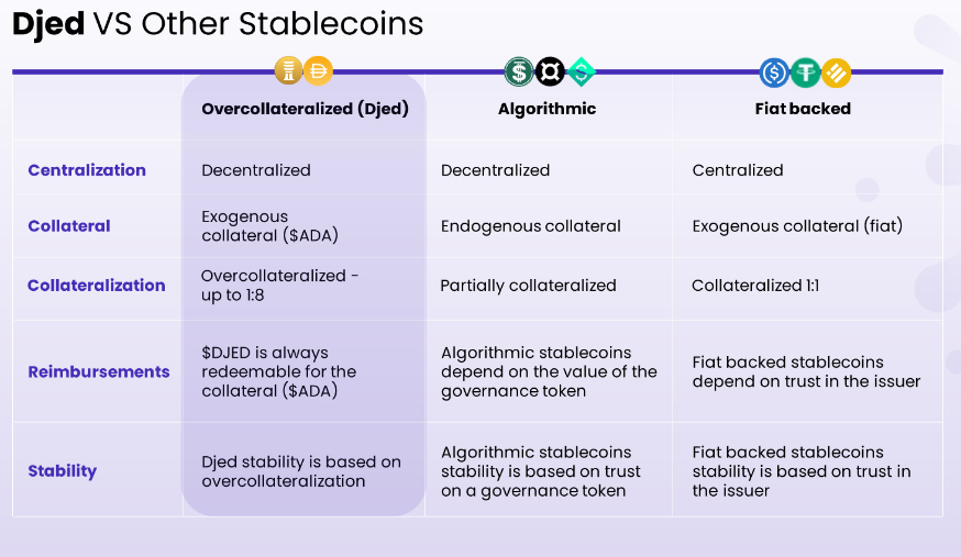 Djed mengklaim berbeda dengan jenis stablecoin berbasis mata uang fiat lain, seperti USDC dan USDT. $DJED adalah stablecoin terdesentralisasi yang tidak membutuhkan perantara dan dapat diverifikasi secara on-chain. Sementara stablecoin yang didukung oleh mata uang fiat bersifat terpusat dan membutuhkan kepercayaan pada otoritas pusat.