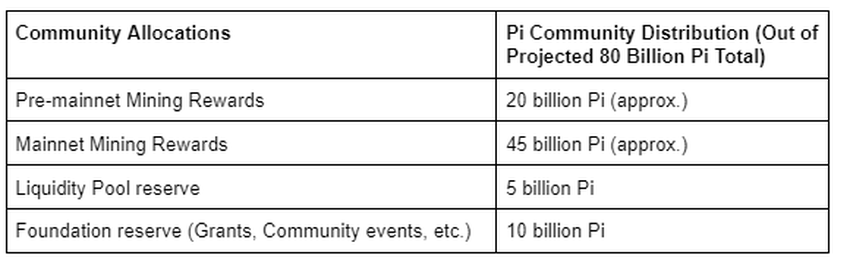 Dari 80% pasokan, 65% alokasinya untuk mining reward bagi komunitas, baik yang sudah mulai menambang atau yang baru akan bergabung. Sementara itu, 10% lainnya akan berada dalam kelolaan Pi Foundation untuk mendukung pembangunan ekosistem. Selanjutnya, 5% yang tersisa menjadi cadangan untuk menyediakan likuiditas bagi Pioneer dan pengembang di ekosistem Pi.