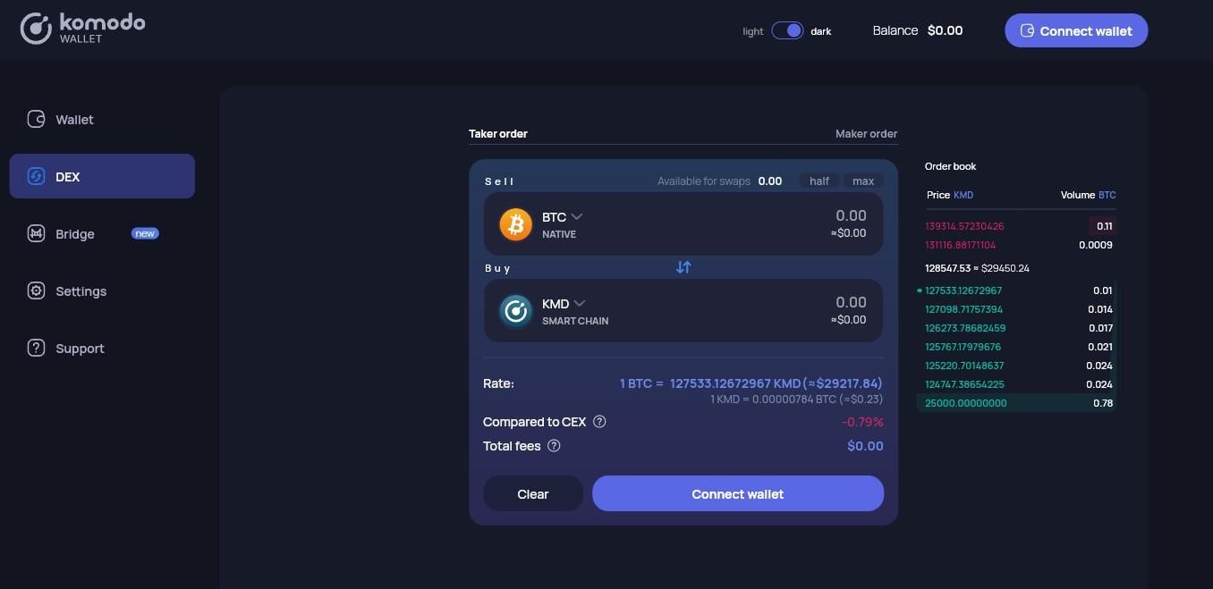 Contoh yang sangat baik dari P2P DEX adalah Komodo Wallet. Aplikasi terdesentralisasi andalan Platform Komodo adalah dompet non-kustodian multi-rantai, DEX, dan jembatan yang semuanya tergabung ke dalam satu aplikasi. Ini menawarkan dukungan perdagangan lintas rantai terluas dari bursa terdesentralisasi mana pun di pasar, termasuk P2P DEX dan AMM DEX.