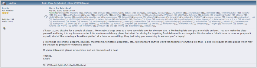 Orang pertama yang memutuskan untuk menjual Bitcoin yang ia miliki menjual aset Bitcoin miliknya pada tahun 2010 silam. Dia memilih untuk menukarkan 10.000 BTC miliknya dengan dua loyang pizza. Jika mengkalkulasikannya dengan harga kini ini, maka BTC itu akan bernilai ratusan juta dolar, jika pembeli tersebut menyimpannya.