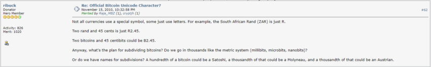 Seorang pengguna membuat proposal. Namun, pada awalnya, tidak ada pengguna BitcoinTalk lain yang mendukungnya. Gagasan itu ditinggalkan, dan tidak ada tindakan yang diambil mengenai saran tersebut hingga 10 Februari 2011. Ribuck membuat komentar yang sama tentang unit denominasi akun. Kali ini, pengguna menerima masukan positif di rangkaian pesan baru tersebut. Sejalan dengan pengguna Bitcoin yang mulai melihat manfaat dari mempertimbangkan unit moneter yang lebih kecil itu, sat pun akhirnya diperkenalkan.