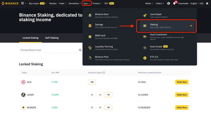 Kamu bisa menemukan fitur Binance Staking di menu bagian atas, tepatnya di bawah “Earn” > “Staking.”