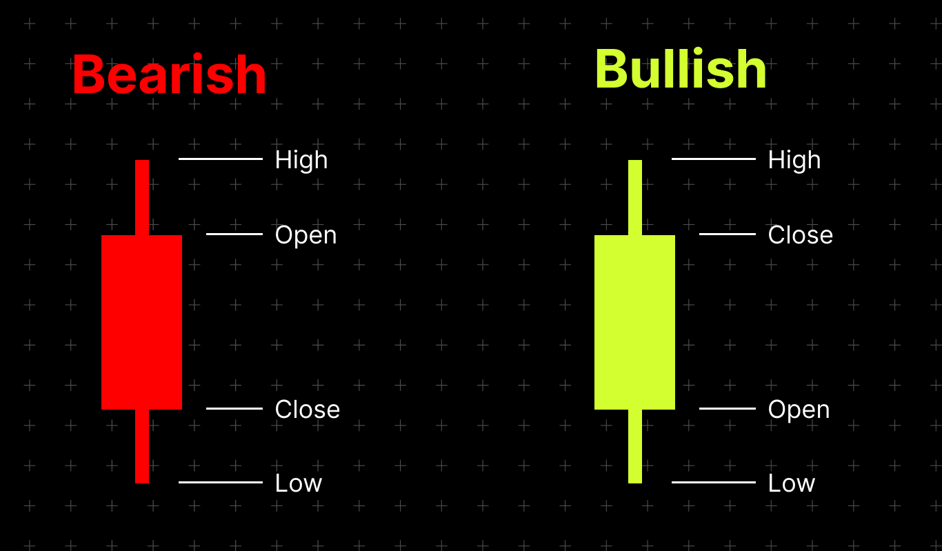 Berdasarkan tren yang muncul di pasar, pola candlestick lengkap dapat terbagi menjadi kategori bullish dan bearish. Candlestick bullish berwarna hijau atau putih, dan menunjukkan bahwa harga cryptocurrency telah meningkat selama periode waktu tertentu. Di sisi lain, candlestick bearish, berwarna merah atau hitam dan menunjukkan bahwa harga cryptocurrency telah menurun selama periode yang sama.