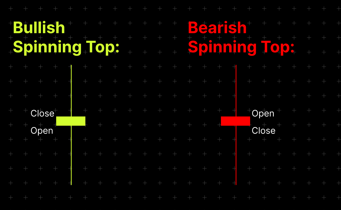 Pola candlestick ini ditandai oleh tubuh kecil dan sumbu atas dan bawah yang panjang. Ini menunjukkan bahwa ada ketidakpastian di pasar, dengan pembeli maupun penjual tidak mampu mengambil kendali. Spinning top bisa menjadi tanda potensi pembalikan tren, tetapi trader harus mencari konfirmasi dari candlestick pattern berikutnya atau indikator lain sebelum membuat keputusan.