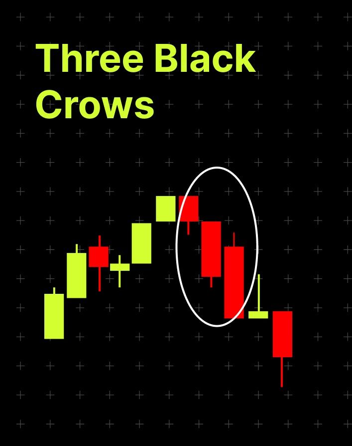 Three Black Crows adalah salah satu pola candlestick bearish reversal yang paling andal. Pola ini dapat muncul di puncak uptrend (tren naik) atau bahkan menunjukkan transisi dari relief rally ke tren turun yang berkelanjutan. Pola ini juga merupakan pola yang berisi tiga candlestick, sesuai dengan namanya.