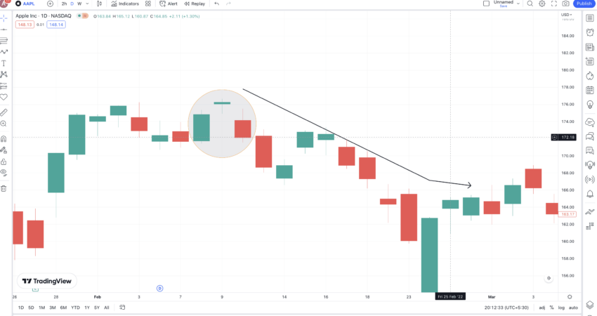 Berikut ini adalah grafik AAPL di mana kami telah memilih pola evening star untuk Anda. Perhatikan bagaimana candlestick merah atau bearish candlestick jatuh lebih rendah untuk memvalidasi pola bearish lebih lanjut.
