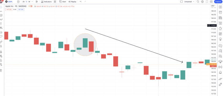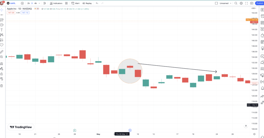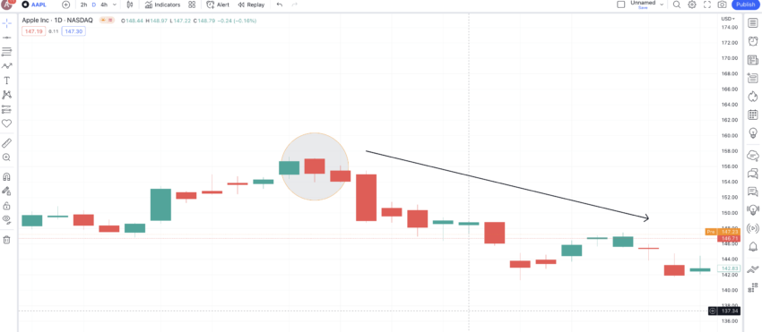 Berikut ini adalah grafik AAPL dari tanggal 3 Mei 2022 hingga 5 Mei 2022. Perlu diperhatikan bahwa ada dua candlestick hijau yang terbentuk, dengan candlestick kedua tetap terpisah dari candlestick pertama. Sementara itu, candlestick merah atau candlestick bearish dibuka di dalam badan candlestick kedua dan ditutup lebih rendah daripada harga pembukaan candlestick pertama, menandai tren turun yang jelas dan dominasi penjual.