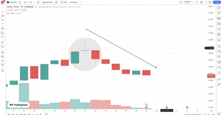 Untuk lebih memahami pola ini, kita akan mengamati grafik XLMUSD sebagai contoh. Stellar (XLM) telah mulai mengalami koreksi harga setelah reli baru-baru ini dengan zona yang dilingkari menunjukkan evening Doji star yang jelas.