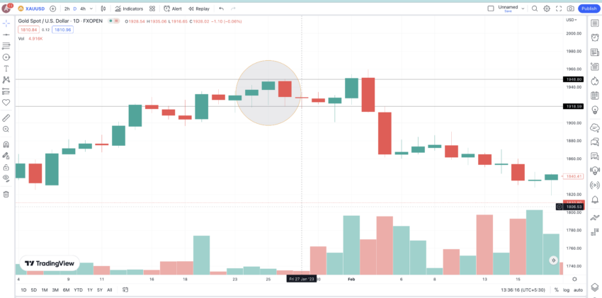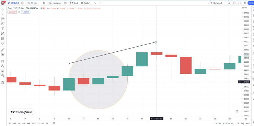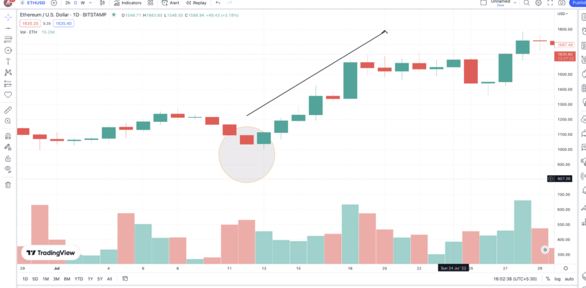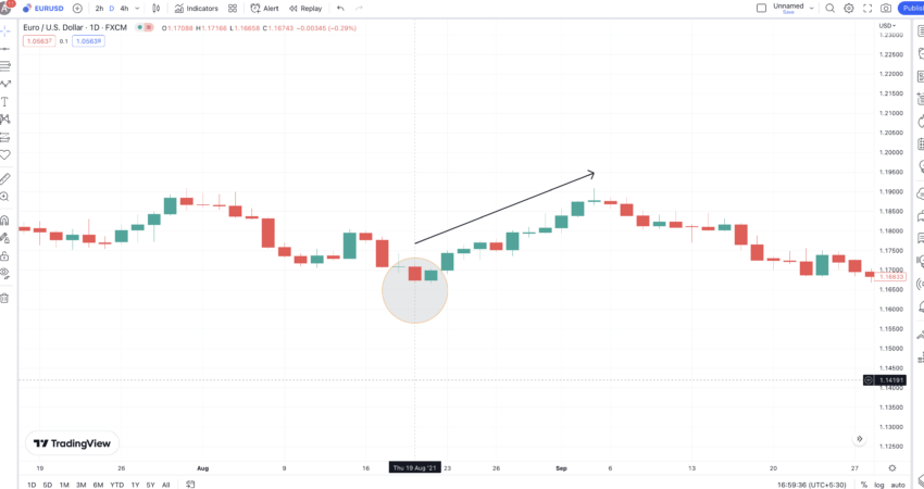 Berikut adalah grafik EUR-USD dengan pembukaan candlestick hijau di bawah candlestick merah. Candlestick ini akhirnya bergerak naik untuk menutupi lebih dari 50% candlestick yang sebelumnya. Sementara itu, lonjakan harga yang terjadi setelahnya terlihat sangat signifikan.