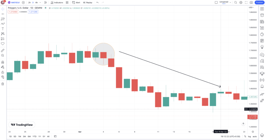 Berikut ini adalah grafik harga harian singkat MATIC terhadap USD. Perhatikan bagaimana pola hanging man yang jelas muncul pada tanggal 4 April 2022. Ada sebuah candlestick konfirmasi yang harus diikuti, yang ditutup lebih rendah dari titik terendah candlestick sebelumnya (hanging man itu sendiri).