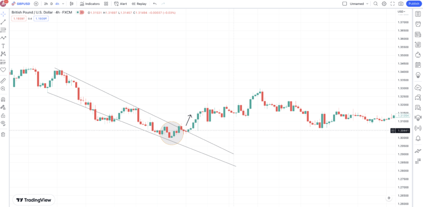 Berikut ini adalah grafik GBP/USD di mana zona yang dilingkari menunjukkan formasi candlestick bullish (three inside up). Namun, konfirmasi yang baik adalah harga GBP menembus pola falling wedge, yang mengonfirmasi kekuatan dari pola candlestick reversal bullish.