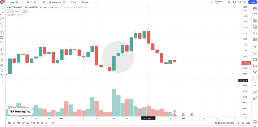 Grafik CRVUSDT dengan zona yang dilingkari menunjukkan formasi “three white soldiers“. Perhatikan bahwa zona ini juga menarik volume perdagangan yang masif, yang mungkin dapat mendorong harga Curve Finance (CRV) menanjak naik lebih tinggi lagi.
