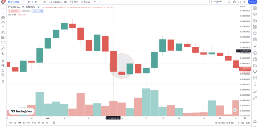 Berikut adalah grafik FTMUSD dengan zona yang dilingkari menunjukkan sesuatu yang mirip dengan pola morning star, dengan candlestick berbadan kecil yang bearish sebagai titik kedua. Kemudian, perhatikan bagaimana harga meningkat tajam setelah terbentuknya pola.
