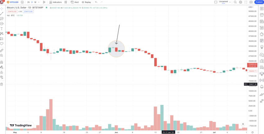 Grafik BTCUSD pada Juni 2021 menunjukkan morning Doji star yang jelas terlihat. Perhatikan bagaimana Doji terbentuk dengan jarak turun dari candle merah pertama. Candle hijau berikutnya tidak hanya melewati titik tengah tetapi juga membentuk formasi engulfing bullish atas posisi short.