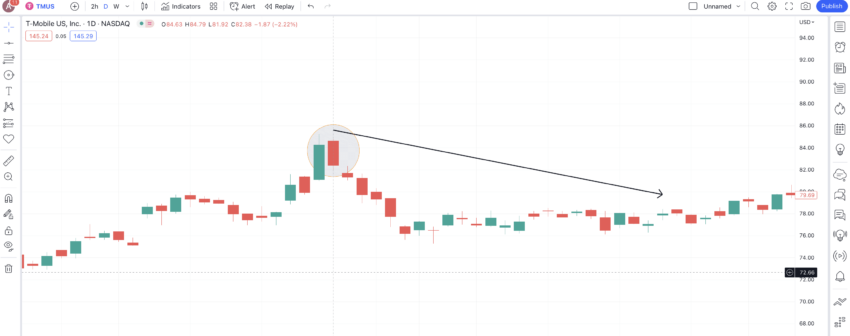 Berikut ini adalah grafik T-Mobile atau TMUS. Pada tanggal 29 Juli 2019, harga TMUS menunjukkan sebuah pola candlestick bearish panjang sesuai dengan formasi Belt Hold. Hal ini mengakibatkan koreksi harga.