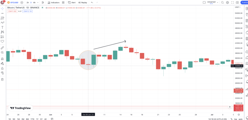 Berikut adalah grafik BTCUSD dari Juli 2021, ketika pola engulfing bullish berbuntut pada relief rally.