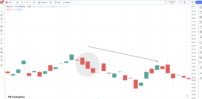 Sementara itu, untuk varian bearish dari pola three-line strike ini, akan ada tiga candle hijau yang panjang diikuti oleh satu candle bearish yang panjang.