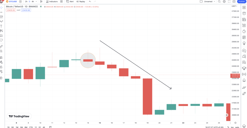 Selanjutnya, mari kita perhatikan bagaimana harga BTC mulai mengalami penurunan volume ketika harganya mencapai US$31 ribu. Zona yang dilingkari menunjukkan pola candlestick reversal bearish atau formasi candlestick Evening Doji Star. Baru setelah itu, harganya mengalami penurunan yang signifikan.