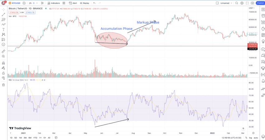 Fase akumulasi adalah periode di mana “smart money” atau pelaku pasar besar (institusi atau trader berpengalaman) mulai mengumpulkan aset dengan harga lebih rendah. Selama fase akumulasi, harga biasanya bergerak mendatar atau dengan tren yang lemah. Hal ini merupakan akibat dari perjuangan antara pembeli (smart money) yang ingin mengakumulasi aset dengan harga yang lebih murah dan penjual yang masih menahan aset mereka. Volume cenderung meningkat ketika harga mendekati level support karena pembeli aktif terlibat dalam akumulasi. Fase akumulasi berakhir ketika harga menembus di atas level resistance utama, menandakan perubahan tren menuju tren naik.