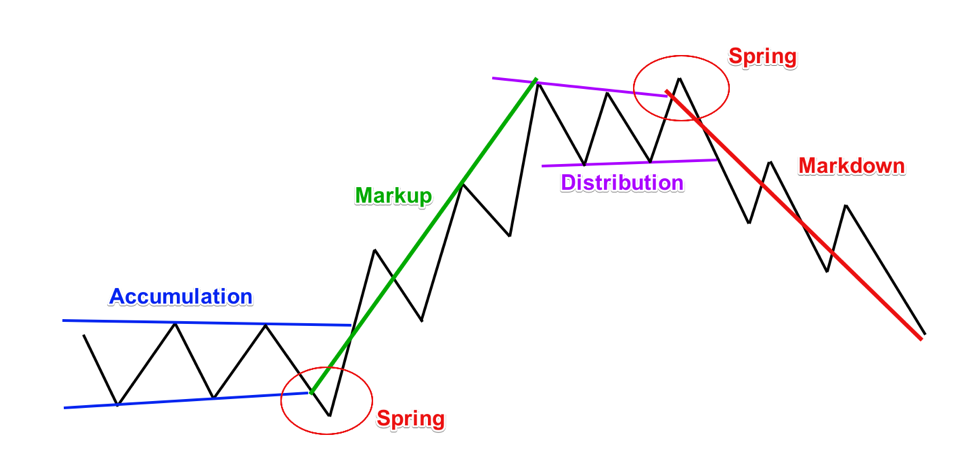 Dalam analisis Wyckoff, terdapat beberapa fase utama yang menggambarkan perilaku pasar dan membentuk pola Wyckoff secara keseluruhan. Berikut adalah empat fase utama dalam siklus pasar Wyckoff:
